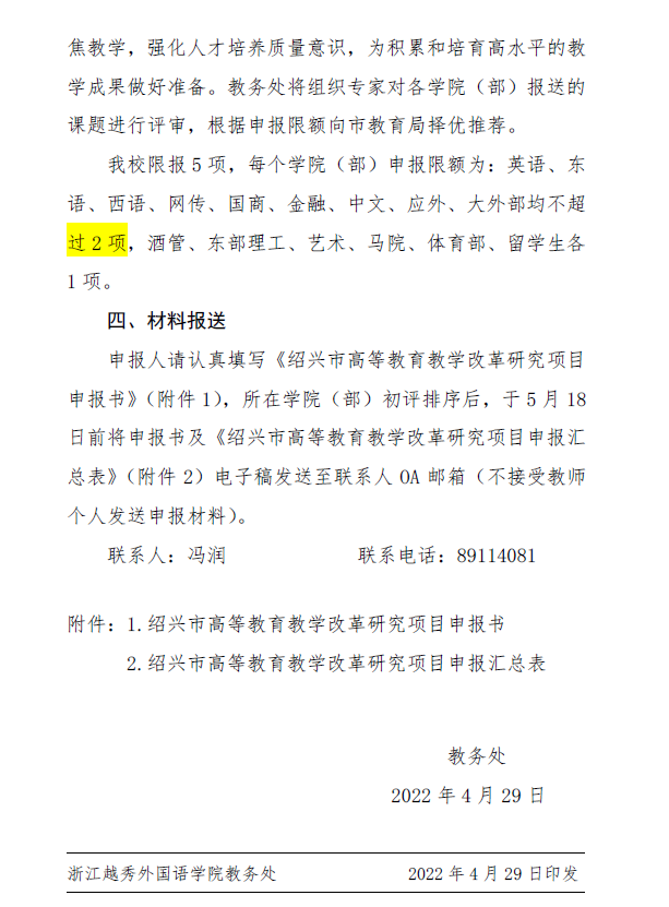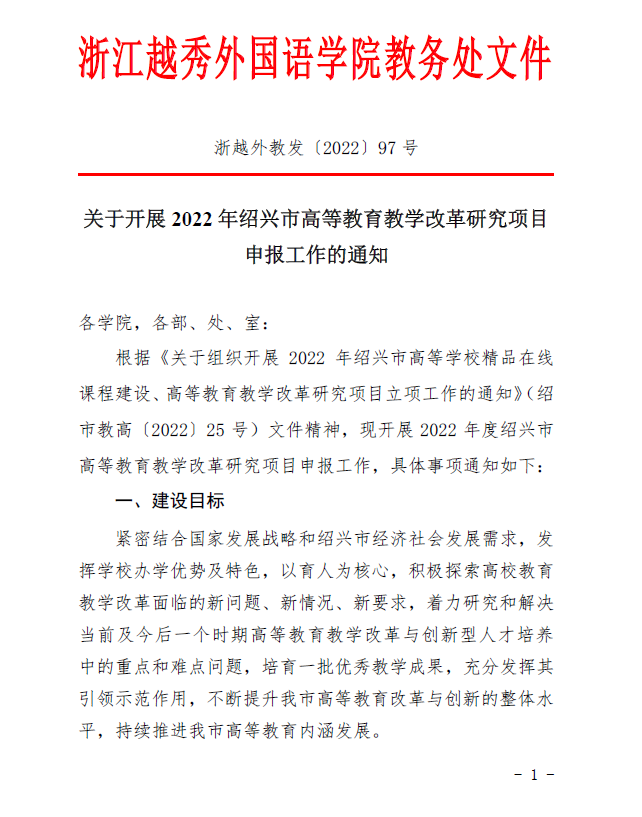 关于开展2022年绍兴市高等教育教学改革研究项目申报工作的通知