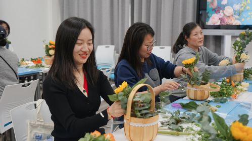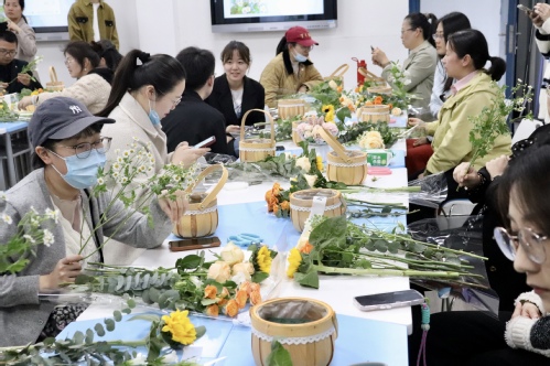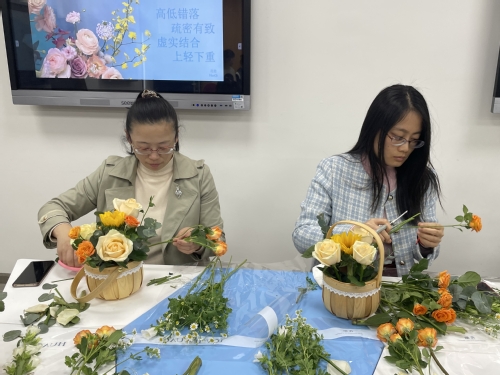 花艺师从基础入手,在细节处讲解,通过生动形象的授课方式,向大家传授插花艺术的知识与技巧,并现场进行了剪裁、插花示范。在老师的指导下,大家将一枝枝鲜花铺在桌面上,闪烁的灵感与独特的审美相结合,每一朵鲜花都在各位老师的指尖绽放出自己的独特魅力。一盏盏错落有致,清新自然的小花篮争先恐后地闯入大家眼帘。