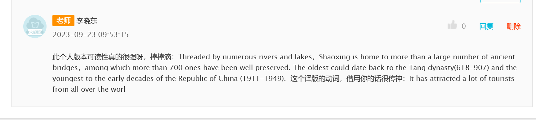 个人版本:Threaded by numerous rivers and lakes,Shaoxing is home to more than a large number of ancient bridges,among which more than 700 ones have been well preserved. The oldest could date back to the Tang dynasty(618-907) and the youngest to the early decades of the Republic of China (1911-1949).