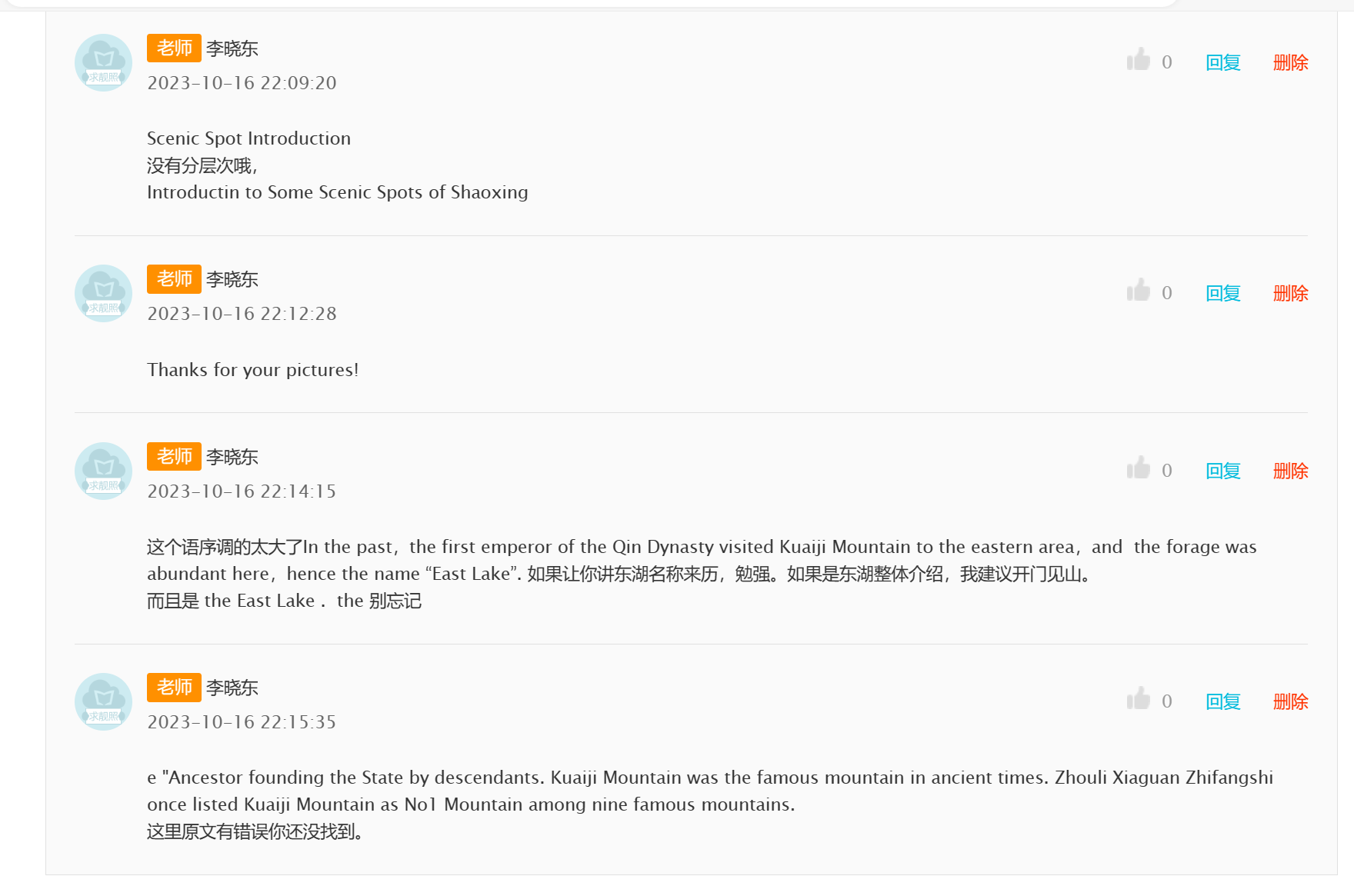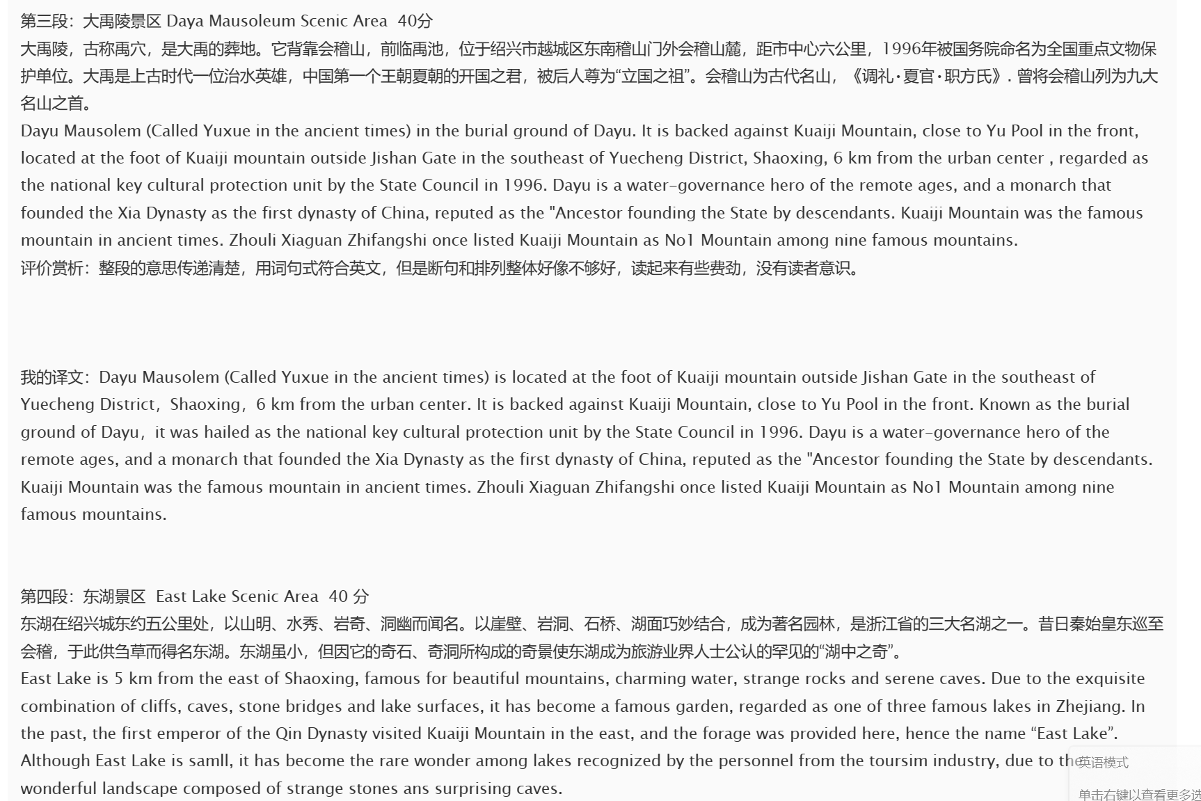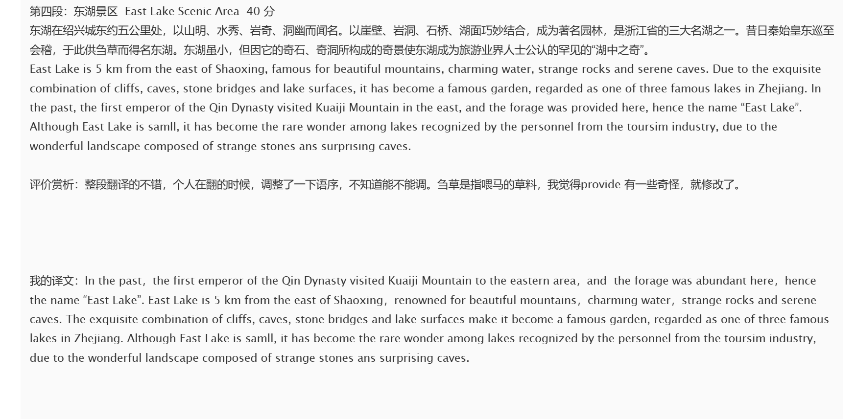 史学家司马迁南游访古,曾“上会稽,探禹穴”。大家利用国庆假期探索绍兴地方文化。同时点评其中英文标识,例如门口的一个标识牌为必做题,首先,对原文和原译文进行赏析和评价,指出优缺点;然后给出你的原创版本,一定是你的版本哦!老师也会做滴,我们一起交流。本次作业100分。