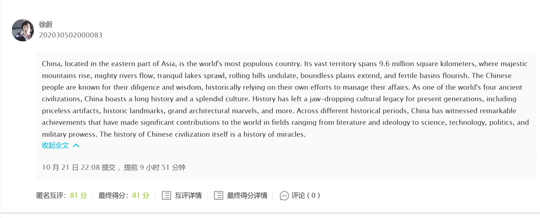 原文:中国地处亚洲东部,是世界上人口最多的国家。它地域辽阔,960万平方公里的土地上高山耸峙,大河奔流,湖泊如境,丘陵起伏,平原无垠,盆地肥沃。中华民族是勤劳智慧的民族,历来依靠自己的力量办自己的事情。作为世界四大文明古国之一,中国有着悠久的历史和灿烂的文明。历史为今人留下了令人惊叹不已的文化遗产,其中珍贵文物、名胜古迹、雄伟建筑等不胜校举。无论是从文学思想还是到科学、技术、政治和军事方面,各个历史时期都见证了其伟大成就对世界的贡献。中国文明的历史本身就是奇迹的历史。