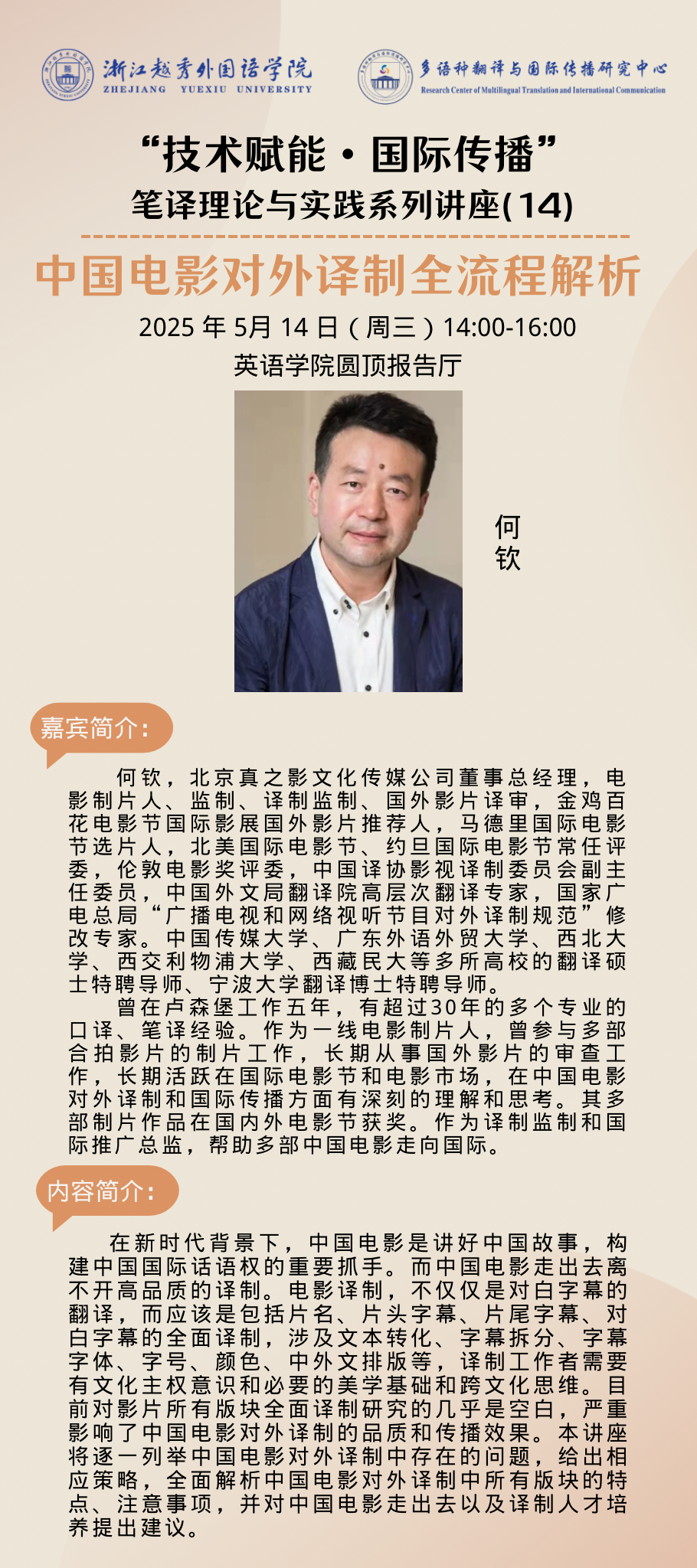 2025年5月14日下午,北京真之影文化传媒公司总经理、资深电影制片人何钦先生受邀莅临kaiyuncom官方网站,为师生带来题为“中国电影对外译制全流程解析”的专题讲座。何钦凭借其30余年影视译制与国际传播经验,深入剖析了中国电影“出海”的关键环节与挑战,为在场师生呈现了行业专家的独到视角和丰富案例。讲座由kaiyuncom官方网站副院长徐英教授主持,吸引70余名师生参加。